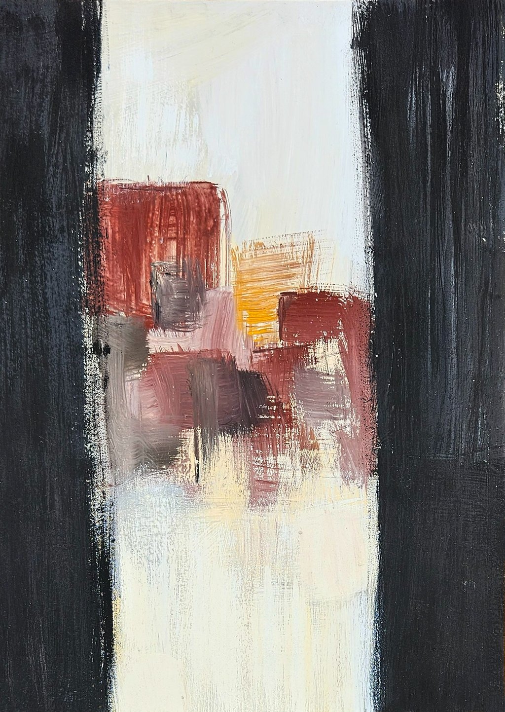 In this series, sand, ochre and other natural materials add texture to the surface giving the works an architectural intention. Again, like much of the work of the studio, it also highlights the specificity of Africa in both the texture and content of the works. The Italian colonial use of white is challenged in many of the works with Libyan burgundy or the volcanic black of the Sahara.